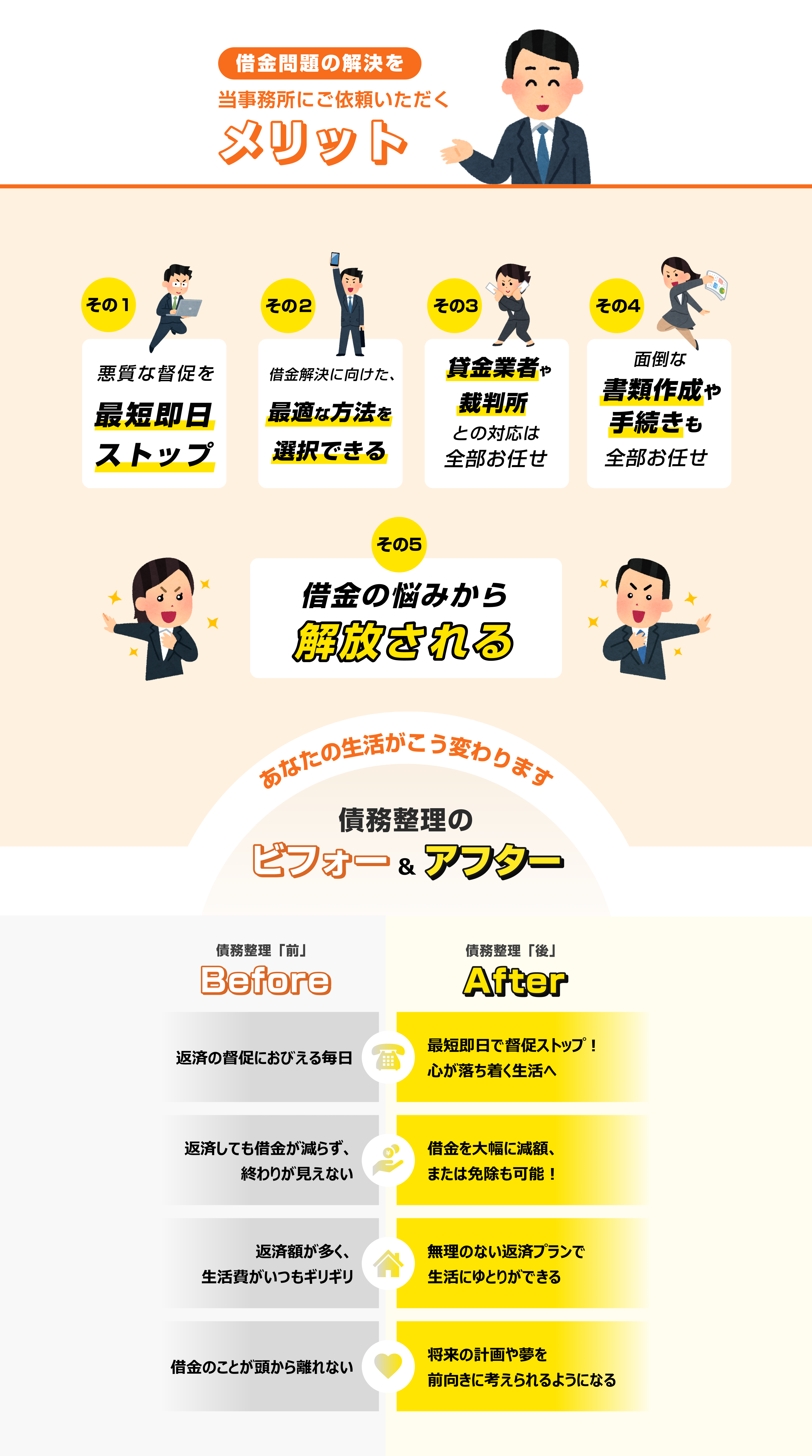 現在は催促などもなくなり、すっきりです。※表記の解決イメージないし事例は、過去の取り扱い事件を元に依頼者の特定を防止するため一部抽象化しております。